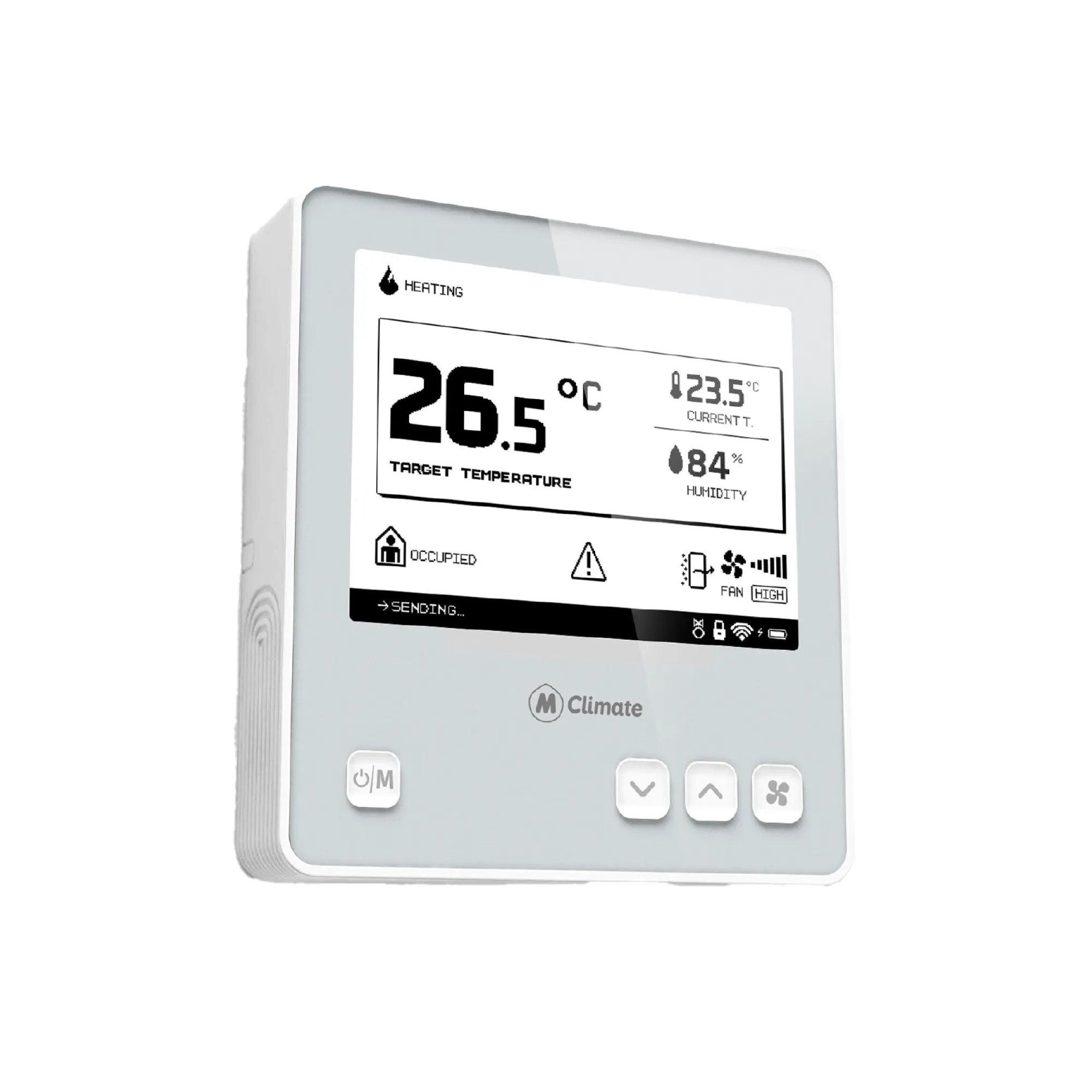 The MClimate Fan Coil Thermostat (FCT) is a LoRaWAN device for 2- and 4-pipe Fan Coil Units, accommodating 3-speed or ECM fans. Ideal for building retrofitting, it enhances energy efficiency and reduces heating/cooling expenses significantly.