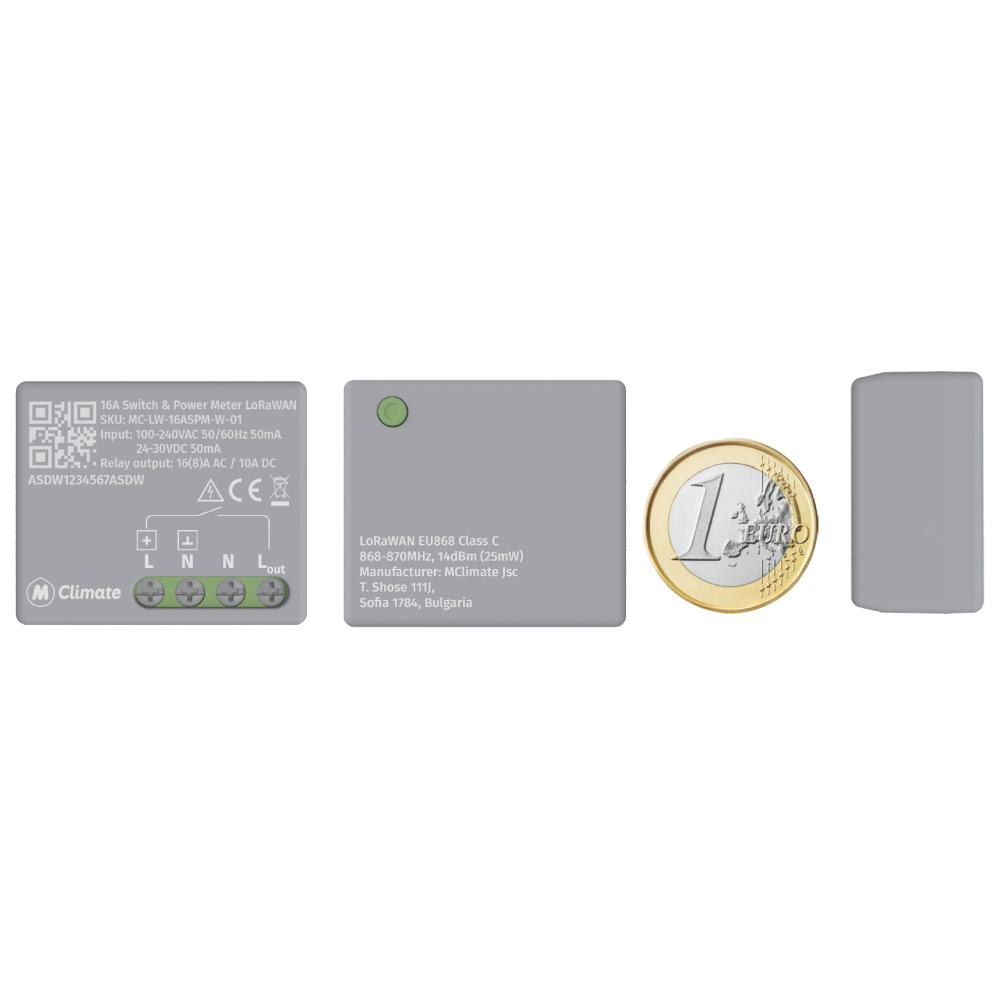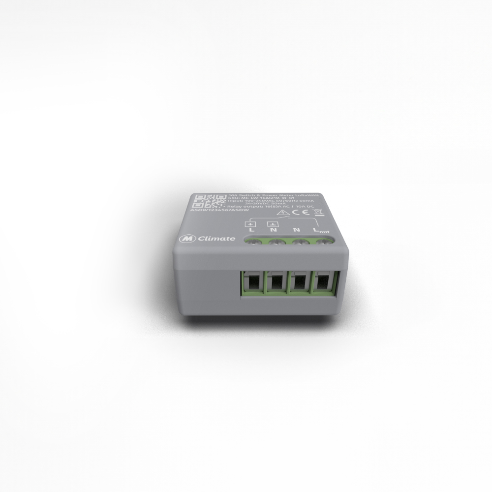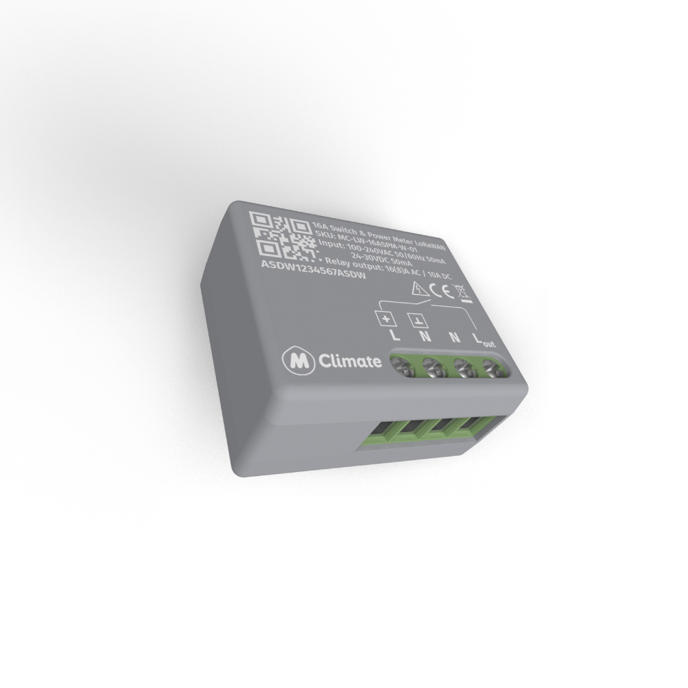 The MClimate 16A Switch & Power Meter LoRaWAN® is a compact 16A relay and electricity meter.
