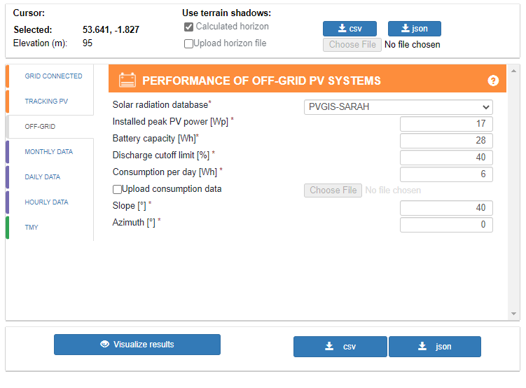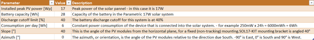 Go to the Off-Grid tab and type the correct details of the solar system. For example, parametric offers the 17W solar panel with a 40° mounting bracket. In this case, settings should look like this: