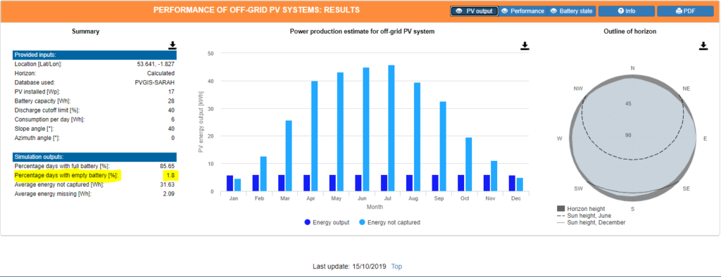 Now, the value of percentage days with an empty battery is 0, which means the 60W solar system should work fine for this location.