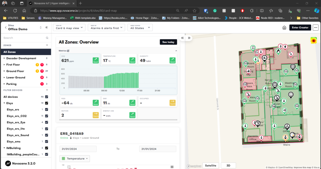 The Novacene platform is an IoT dashboard system that represents values from your sensors in a graphical way. Moreover, it allows you to digitise the floor plans of your building and place the deployed devices in areas where they are installed. This platform is hosted online and can be accessed from any device by simply visiting the app.novacene.io website.
