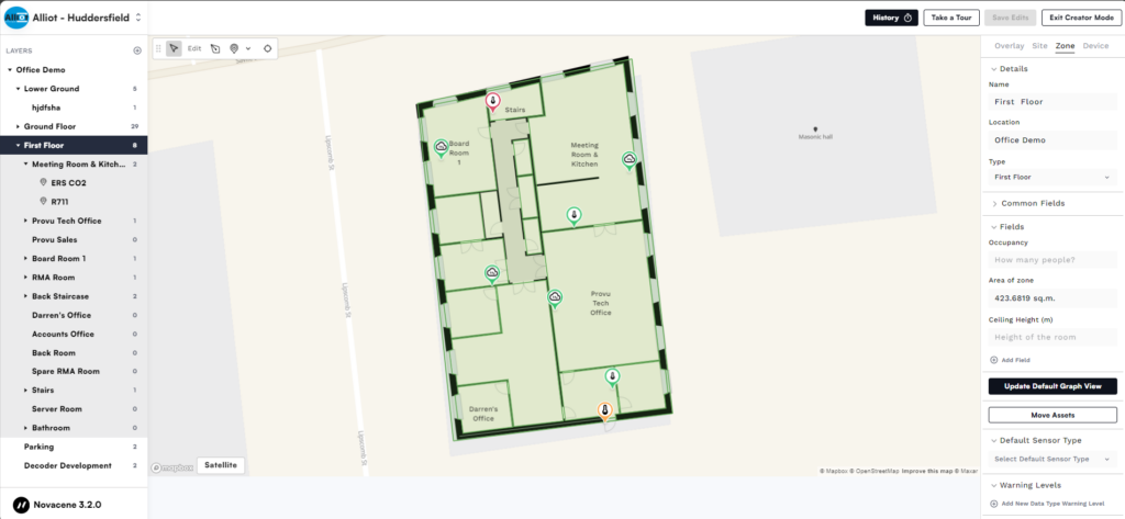The Novacene dashboard is fully customisable which means you can adjust everything to suit your use case. To make edits all you need to do is to enter the Creator Mode which unlocks plenty of adjustments starting with the geozones, through adjusting the position of particular devices and finishing with setting up various rules and alerts.