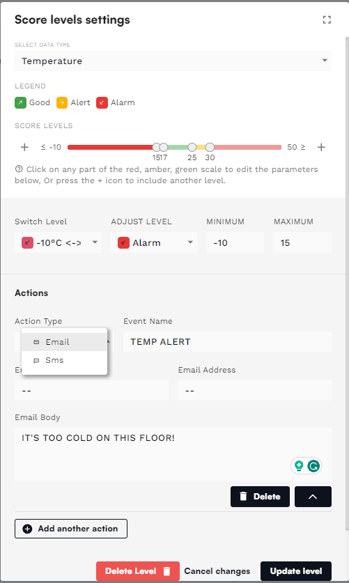 Rules and alerts can be created per zone. For example, you can create a rule where you will be notified if the temperature in a particular zone exceeds a certain value and also be notified with another message when the temperature goes below a certain value. Currently, notifications can be sent as emails or text messages (SMS). The content of the message is also fully customisable.